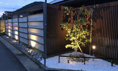 木目調の部材を縦格子やフレームに使用し、Gスクリーンを組み合わせることでモダンな雰囲気に仕上がっています。ライトアップするとフェンスとスクリーン越しに明かりが見えて、非常に幻想的な雰囲気に。縦格子フェンスからは適度に外が見えるので、視線を遮りつつも、安全性に配慮したフェンスです。