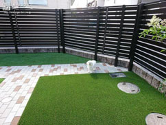 ワンちゃんと一緒に生活するにあたって、ワンちゃんが安心して走り回ることができる庭づくりは必須です。目隠しフェンスで周囲からの視線も遮断できるので、開放感がありながらもプライバシーを守れる庭になっています。また、通用門も設置しているので、お散歩での出入りも簡単です。