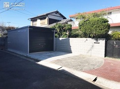 シャッター付きのガレージ施工例です。重厚感のあるガレージで存在感がありますが、車庫の色と塀の色を合わせたことで、全体のバランスが取れています。