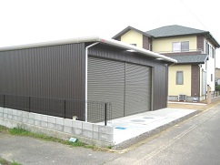 シャッター2台分と、広々としてゆとりのあるガレージの施工例です。全面が壁で覆われているので、車を雨や風、紫外線から守れる上に、ゆとりがあるのでタイヤや工具などの保管も十分可能となっています。